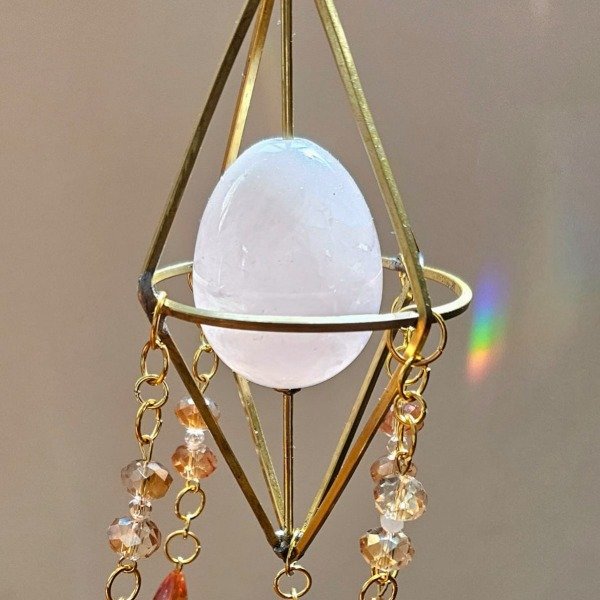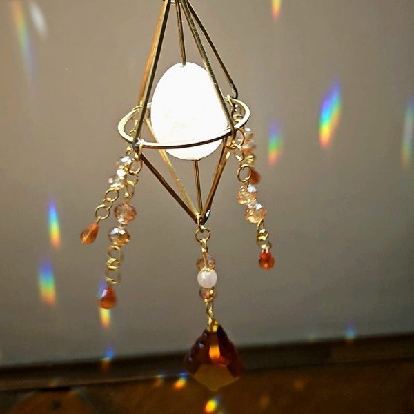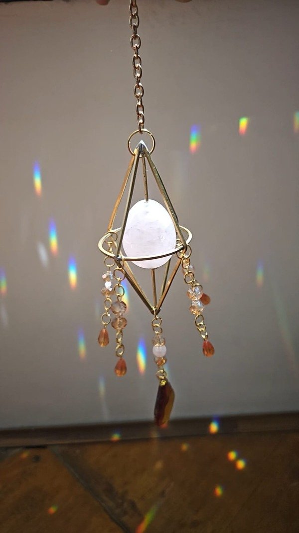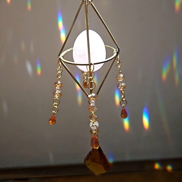 Atrapasol en bronce con cuarzo rosa y cairel antiguo color ámbar.